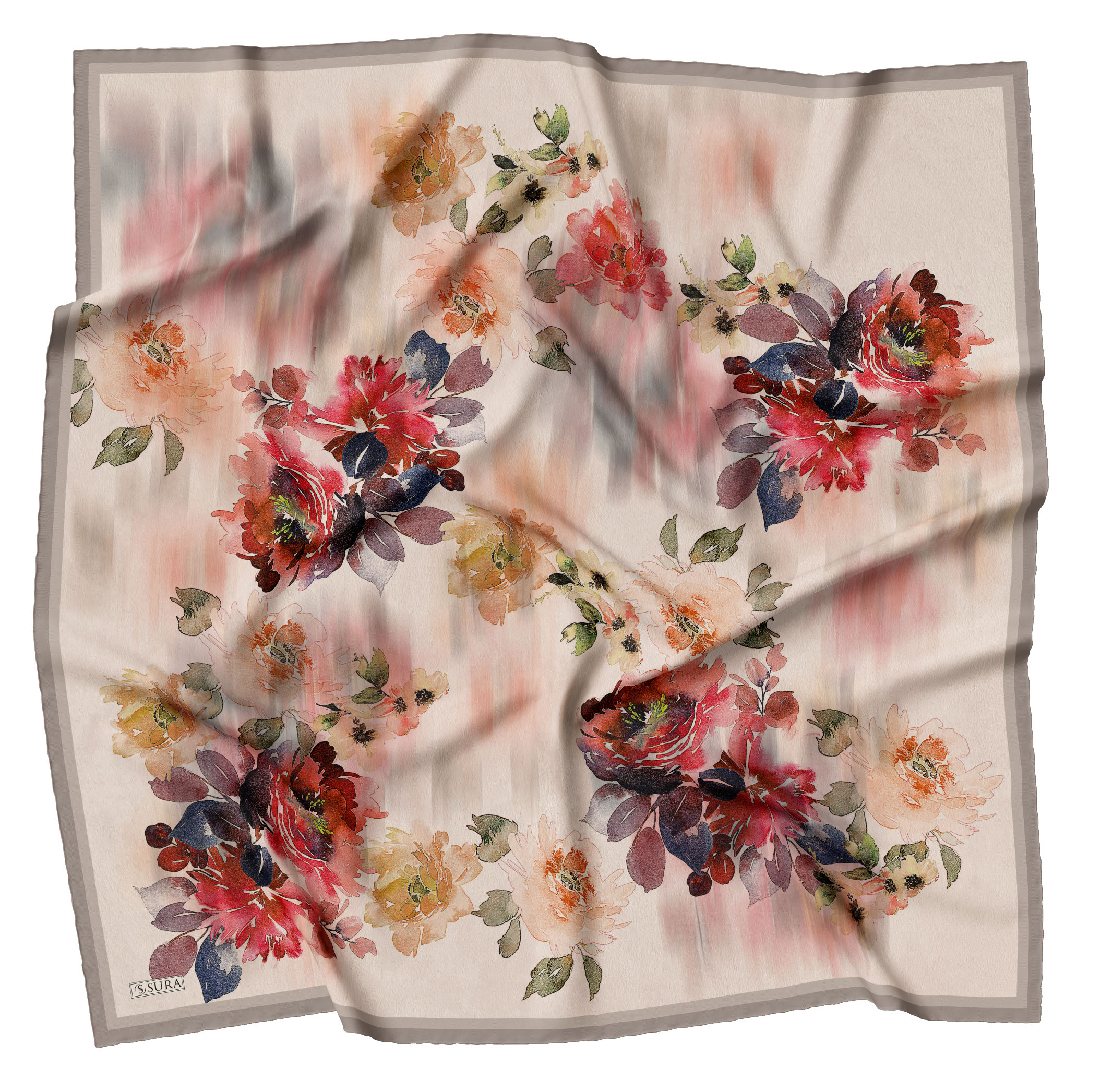 Sura İpek Eşarplar; % 100 İpek olarak 90*90 cm ölcülerinde ve kenarları tamamen el dikişi yapılarak beğenilerinize sunulmuştur.